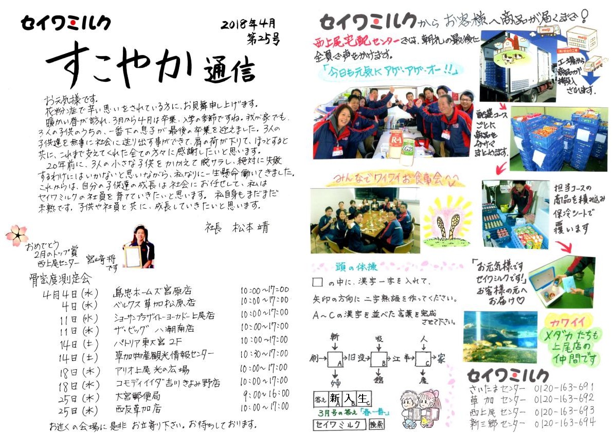 2018.03.26 すこやか通信30年4月号 すこやか通信4月号を掲載しました。今月号の制作担当は、上尾宅配センター広報委員です。上尾センターには、かわいいメダカもいますよ。今月のクイズの答えは 「新入生」です。